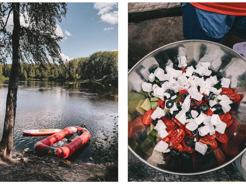The day began once again with a delicious breakfast: millet porridge, pancakes with sour cream and condensed milk, baked omelet just like in kindergarten, and freshly brewed coffee. Well fueled, we were ready for rafting.
