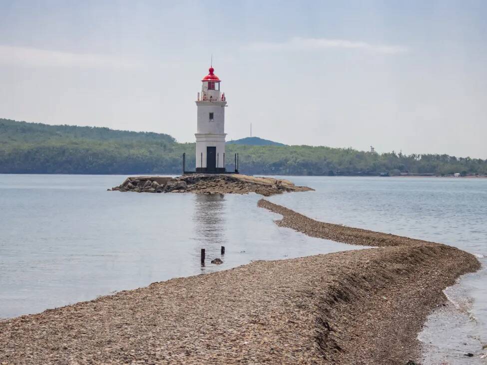 The lighthouse is still operational and is maintained by the Hydrographic Service of the Pacific Fleet. For a long time, it was hidden from residents and tourists behind a fence, but the barrier has been removed, and visitors now come here regularly. In winter, spotted seals (largha seals) can sometimes be seen here. In summer, locals relax on the shoal. To reach the lighthouse, you’ll need to walk through water that can be almost knee-deep. Flip-flops, Crocs, or aqua shoes are recommended, as the seabed is rocky.