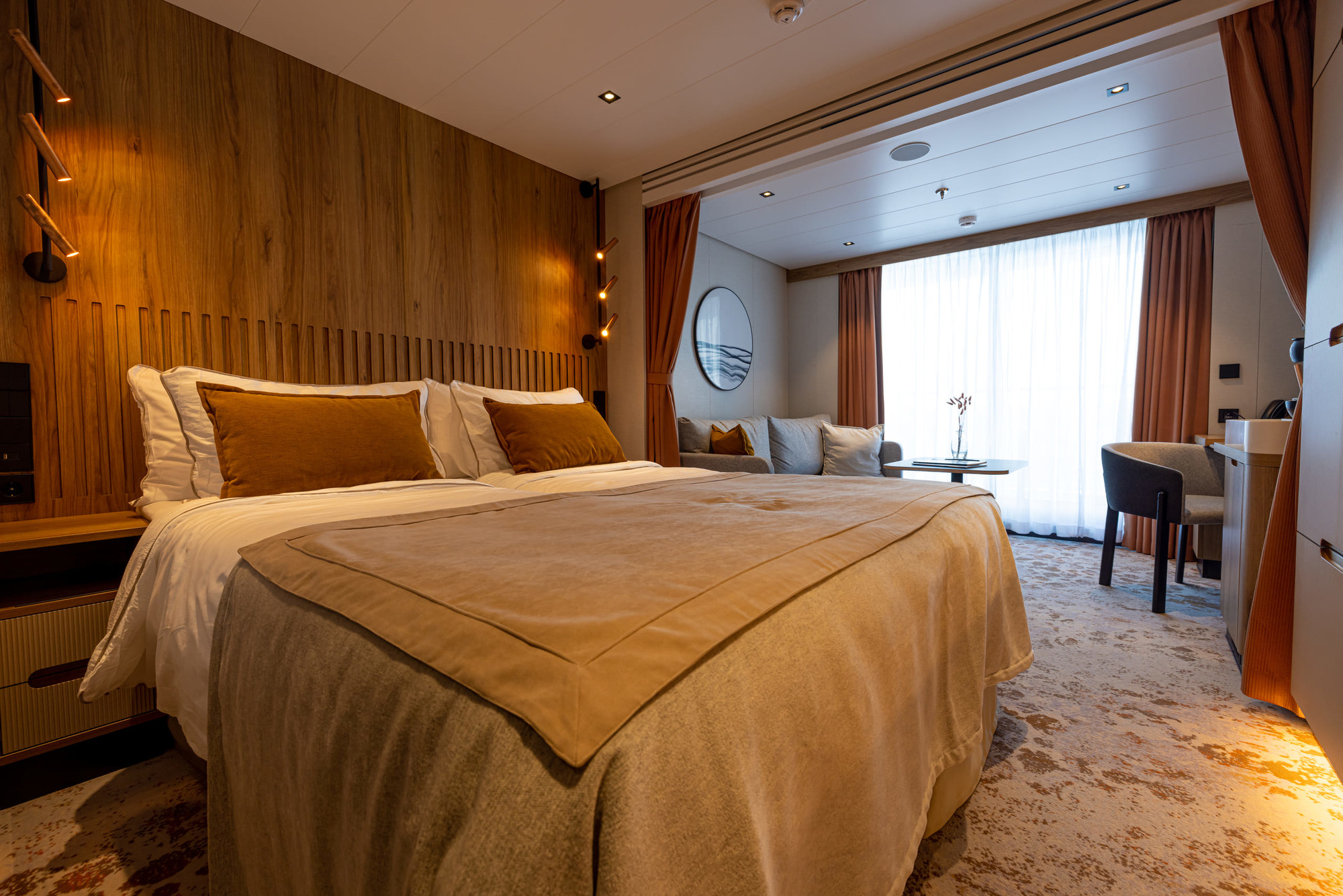 Built in 2021 at a Finnish shipyard, the vessel is equipped with an ice-strengthened hull and extra-large stabilizers. It accommodates up to 140 guests in luxury suites.