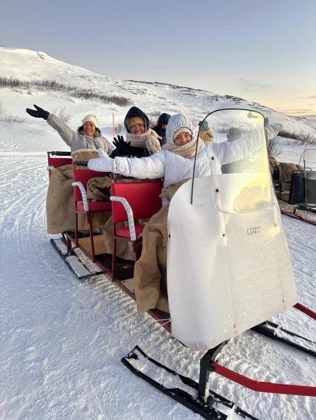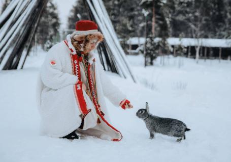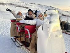 You will arrive at the park by sleigh, where you will meet the huskies, learn about the history and characteristics of the breed, and enjoy a dog-sled ride across the tundra (two people per sled). You will also meet the Indigenous Saami people, discover their culture, and see reindeer.