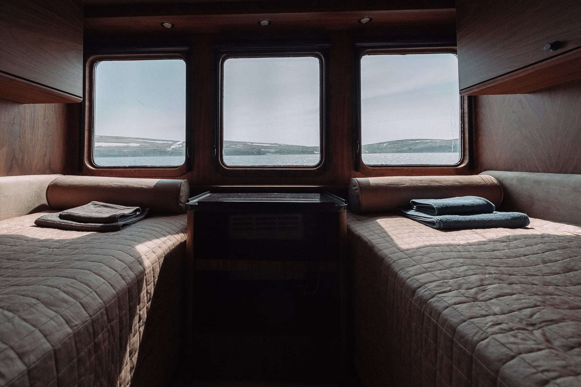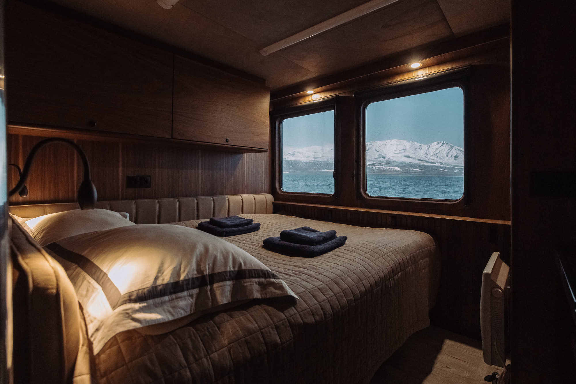 You will be accommodated in six cabins (two with double beds and four with twin beds). Each cabin has windows, beds, a desk, closets and shelves, hangers, and personal reading lights. Three showers and three toilets are located on the same deck. All rooms are sound-insulated, ventilated, and heated.