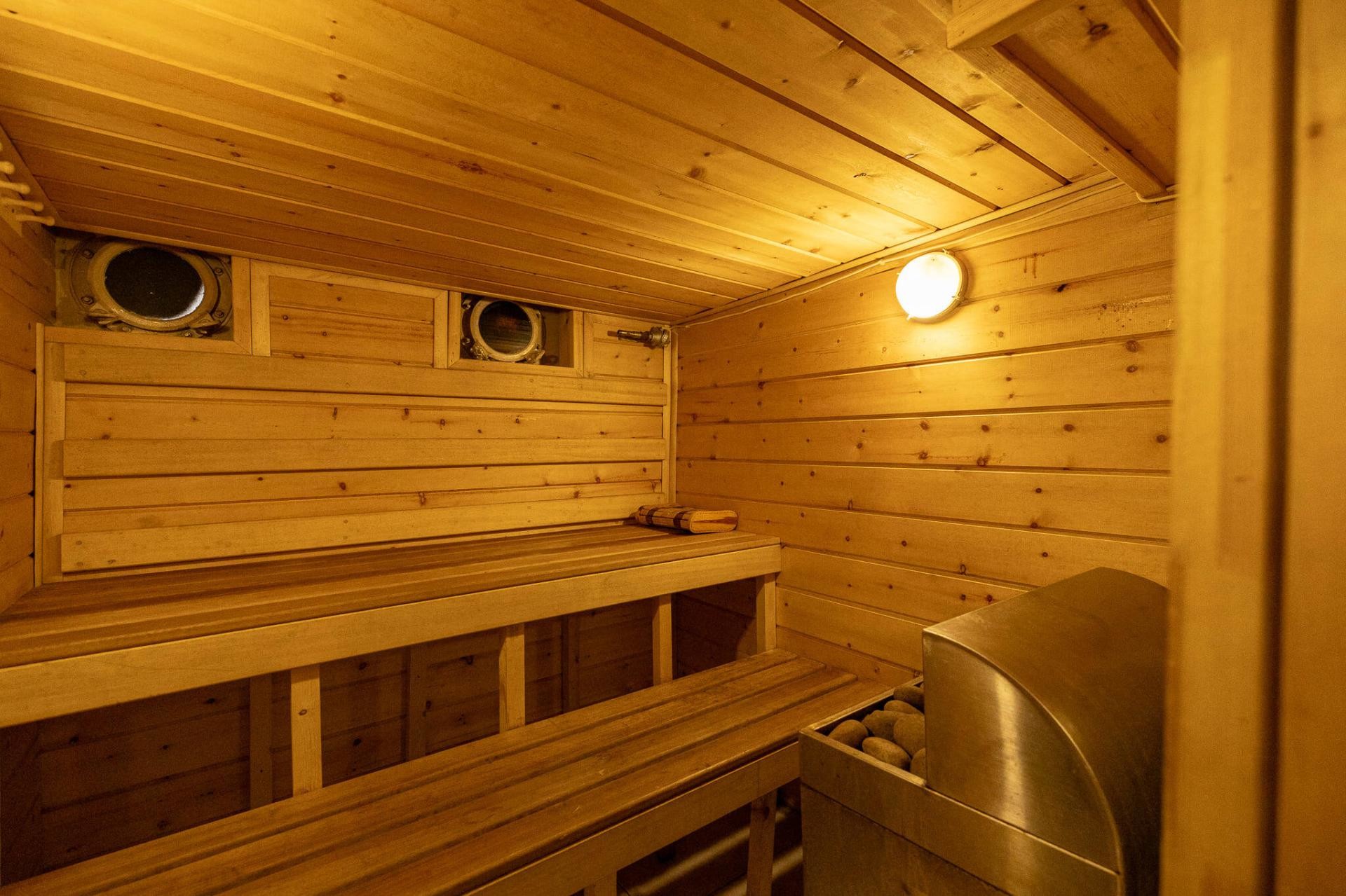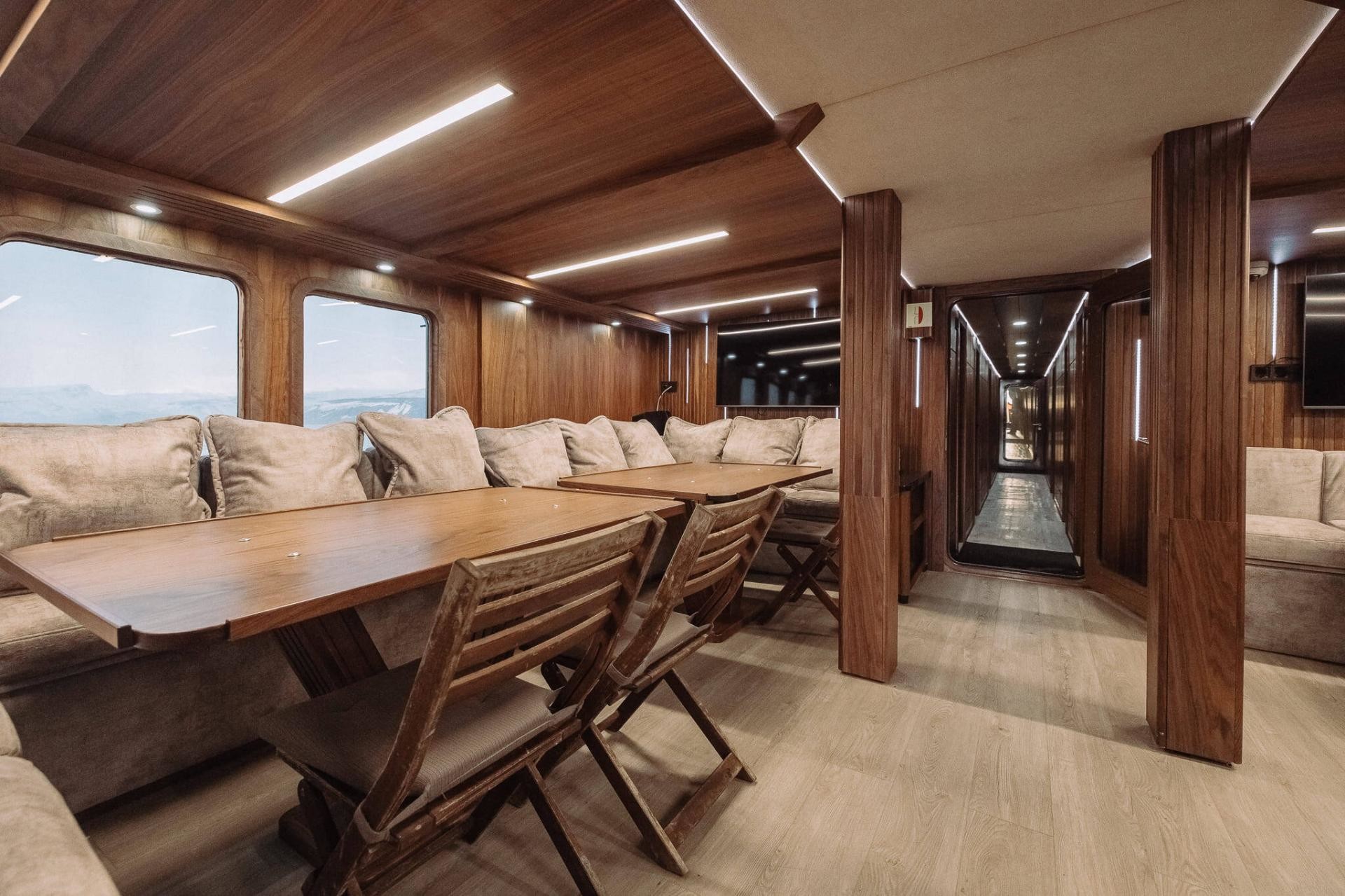 Onboard facilities include a Finnish sauna (available during stops), open decks for relaxation and photography, and a spacious lounge with a bar, karaoke-equipped multimedia center, TV monitor, and themed books.
