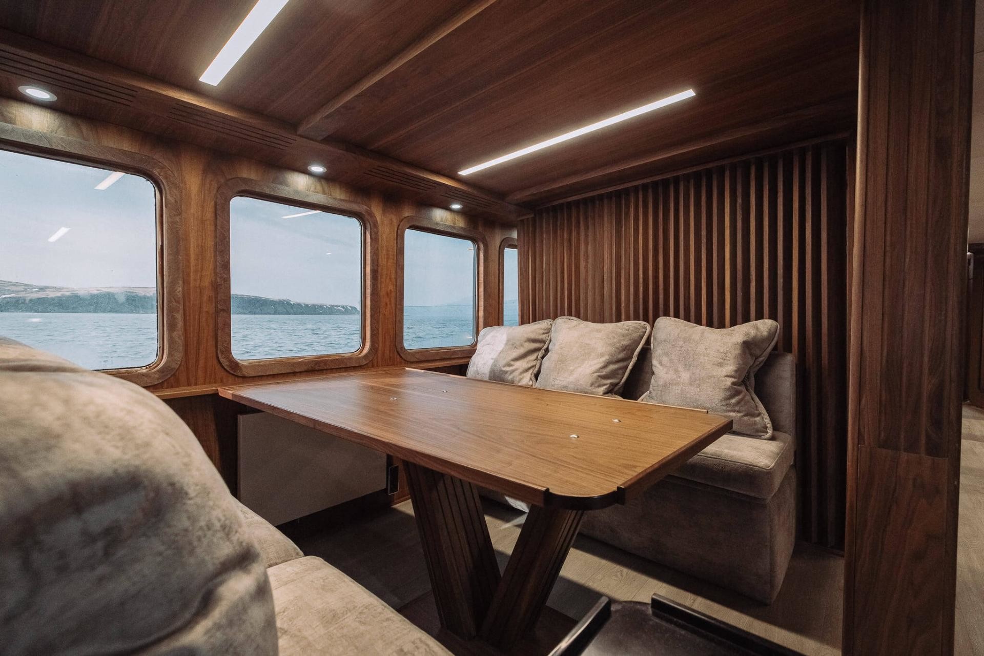 Breakfast, lunch, and dinner are served in the lounge. Tea and machine-made coffee are available 24 hours a day. Use of SUP boards, kayaks, foilboards, trekking poles, tents, and sea-fishing gear is included in the cruise price.