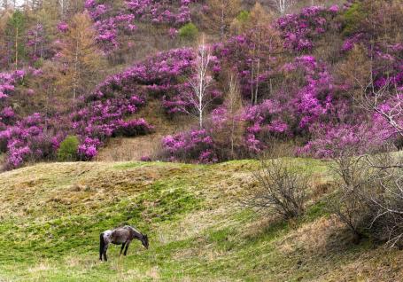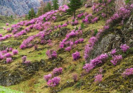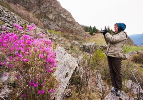 On this journey, you will witness the awakening of nature in the Altai Mountains: you will see the first spring flowers and the birds that have returned from their wintering grounds. The route is planned around the main blooming areas of Rhododendron ledebourii, the Siberian rhododendron (maralnik). If you're lucky, one day you might find bushes not only with pink flowers but also with the rarer white ones.