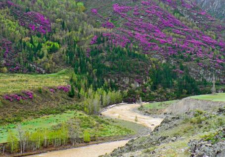 Along the way, you will stop at scenic viewpoints — about an hour later, the first blooming Siberian rhododendron (maralnik) bushes will appear on the banks of the Katun River.