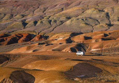 Next, your journey leads to the colorful hills of the Kyzyl-Chin River valley, which tourists call the Altai Mars. The landscapes here are painted in various shades of red—from bright orange to dark brown. In the first half of May, it is still early spring in the valley, and the river may be covered with ice. But the atmosphere is defined by the multicolored mountains. On foot, you will walk to Mars-2 to see all the bends and hidden corners of the red canyon.