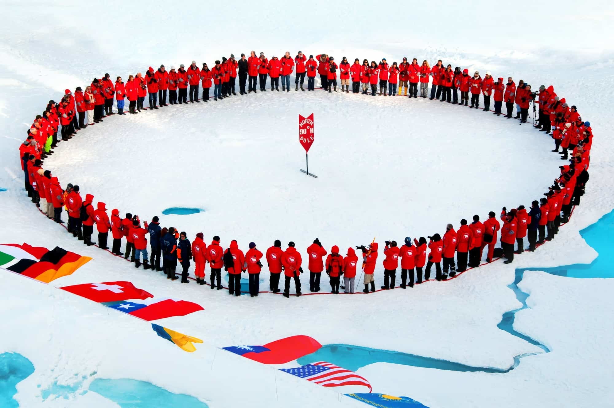 Welcome to the geographic North Pole! All meridians are met at this point. You will make the shortest circumnavigation of the globe just by going around 90° North.