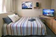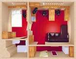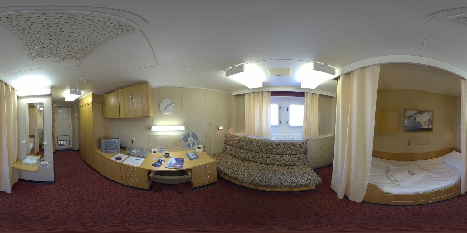 One lower berth, one sofa bed, private facilities with a shower, TV set and DVD player, opening windows. The square is 14 sq.m
