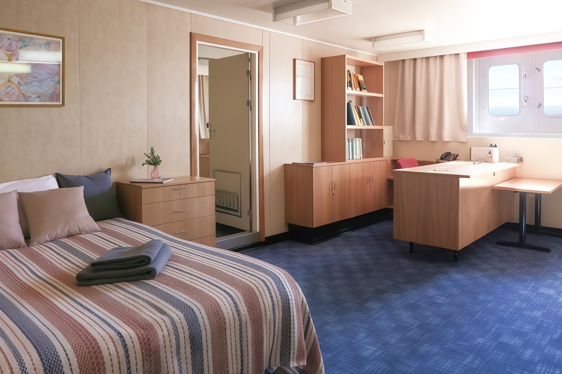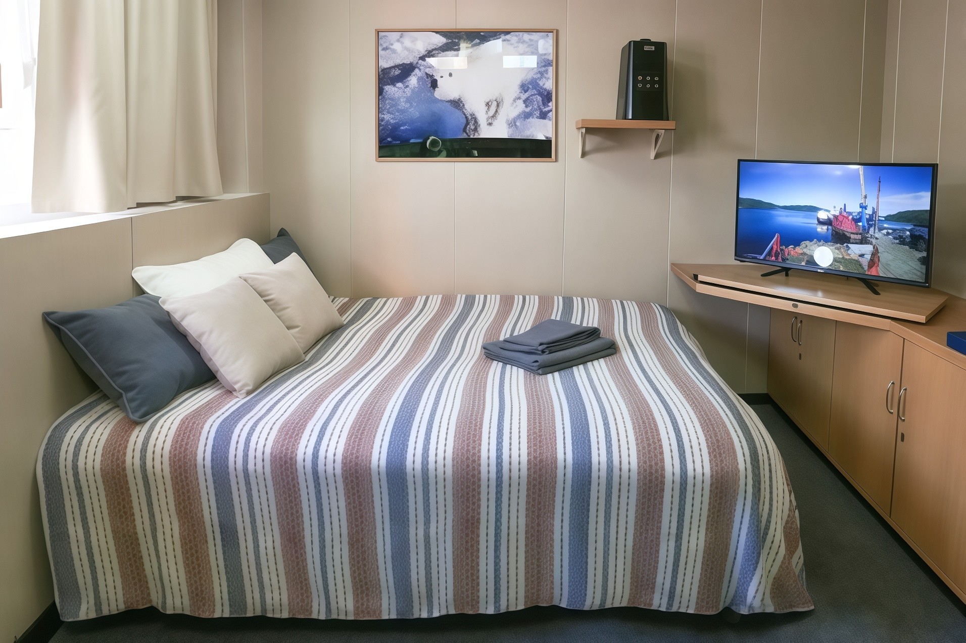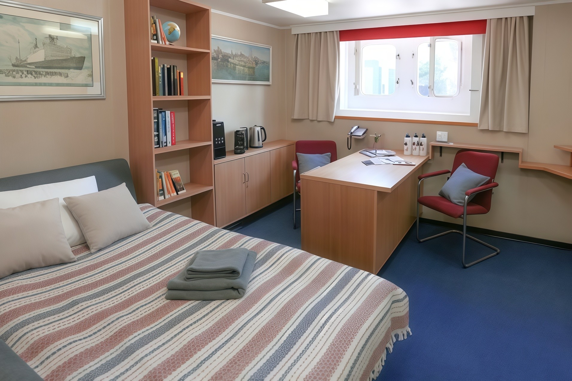 You can take advantage of the on-board facilities: polar library, volleyball court, gym, two saunas, warm seawater pool, souvenir store and massage treatments. Watching seabirds and whales is possible from the panoramic open decks as well as from the outside windows of the cabins.