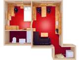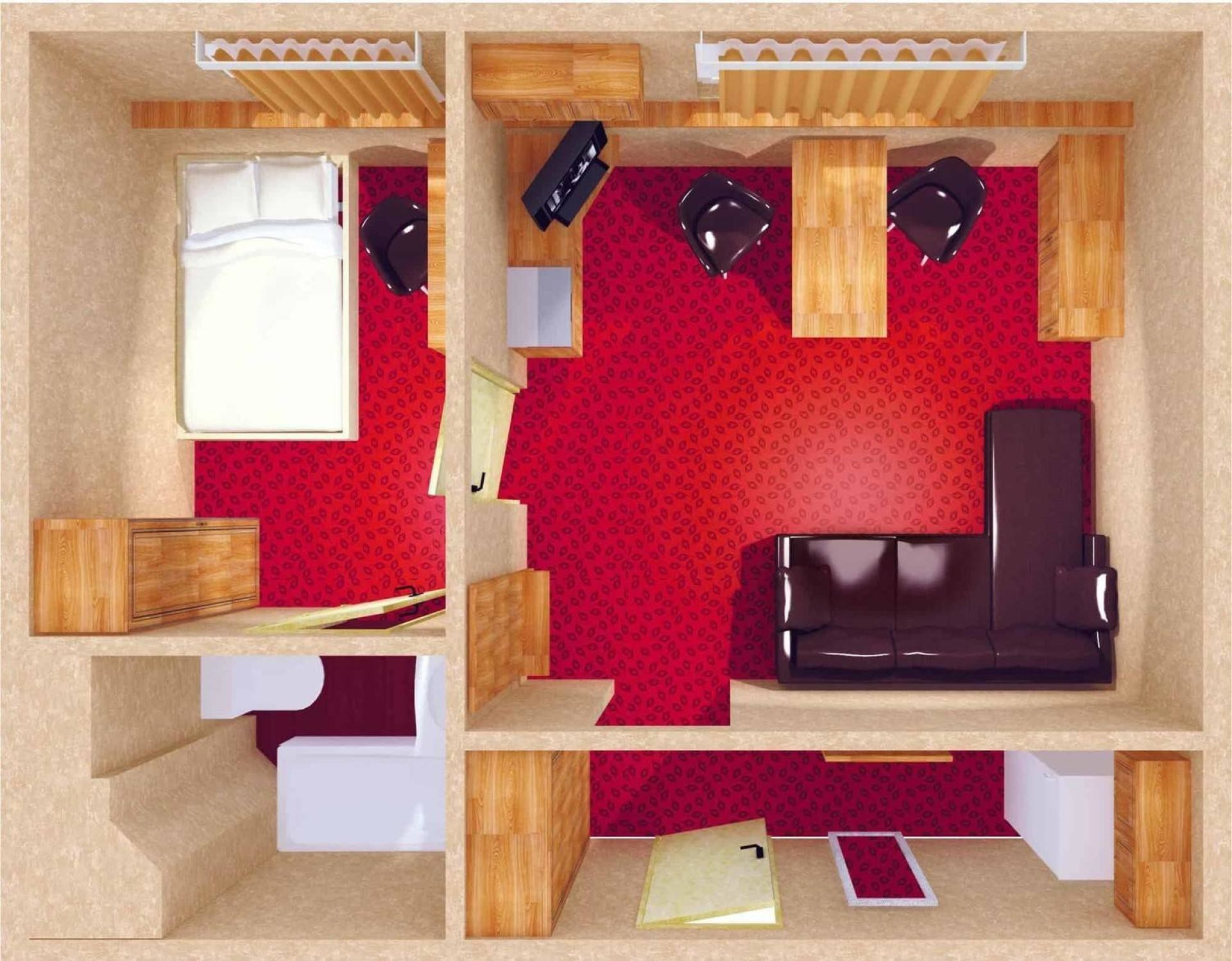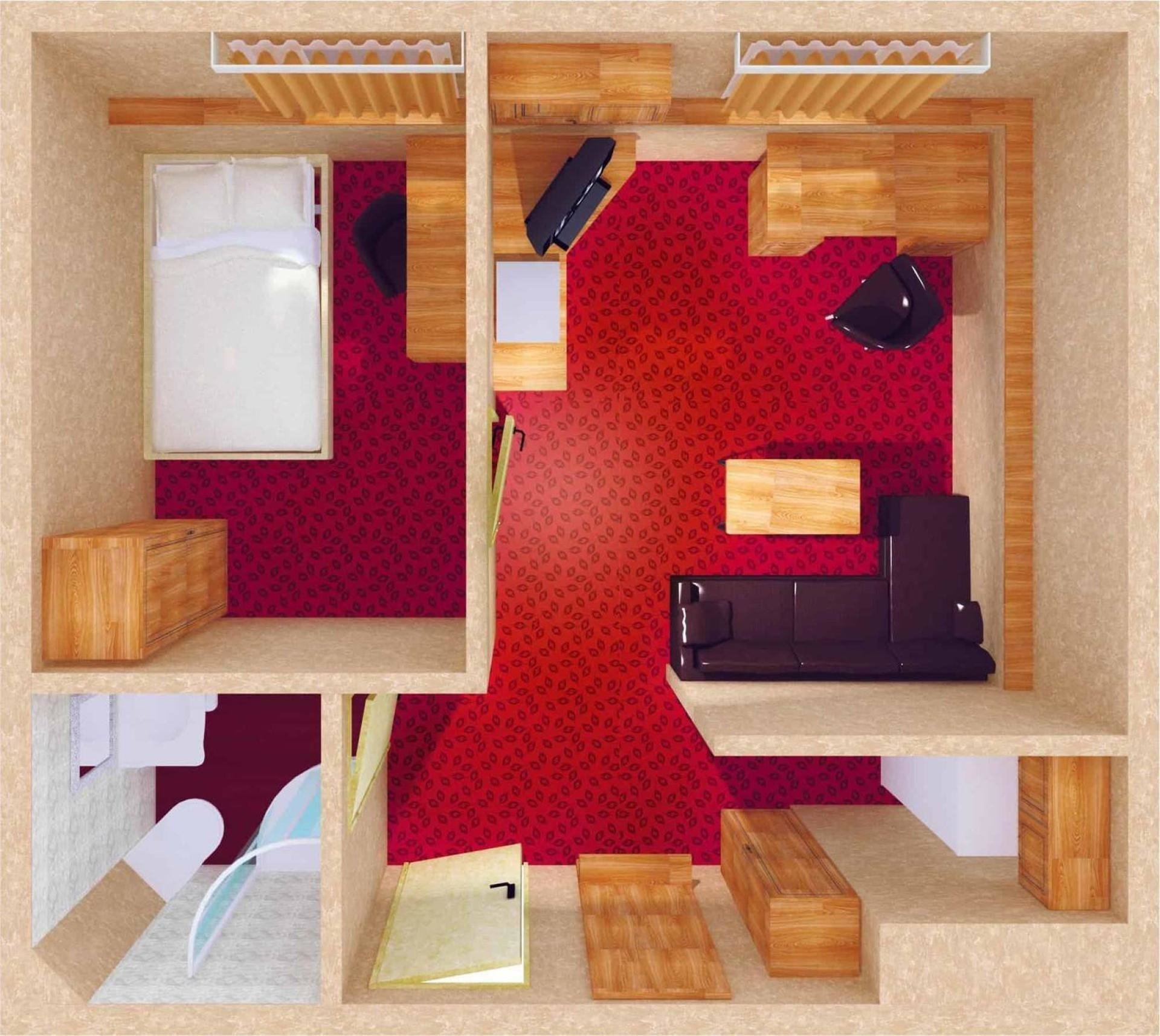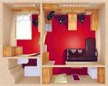 Bedroom, sitting room, private facilities with a shower, bed, sofa, refrigerator, TV set and DVD player, coffee maker. The square is 27 sq.m